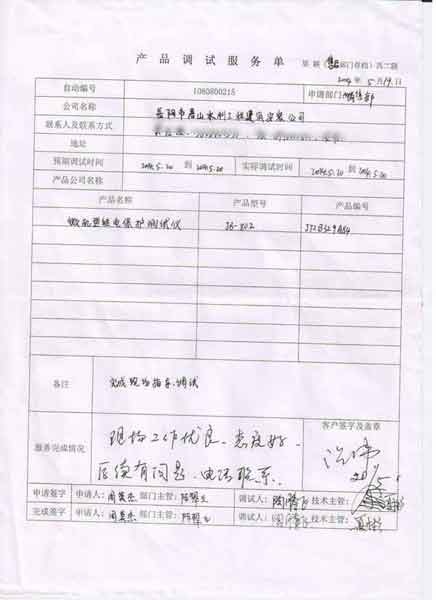 2014-05-20  岳陽市君山水利工程建筑安裝公司進(jìn)行調(diào)試服務(wù),調(diào)試產(chǎn)品:CYJB-802 微機(jī)型繼電保護(hù)測試儀