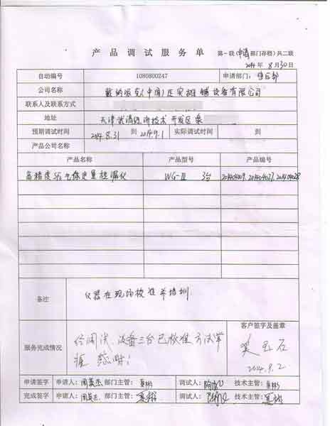 2014-08-31  戴納派克(中國(guó))壓實(shí)攤鋪設(shè)備有限公司進(jìn)行調(diào)試服務(wù),調(diào)試產(chǎn)品:CYWG-III高精度SF6氣體定量檢漏儀