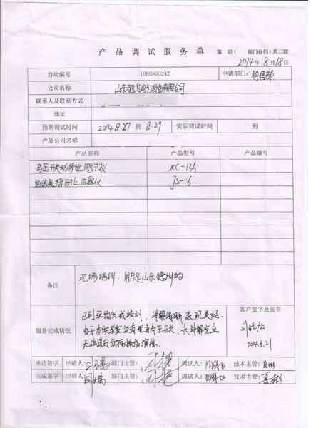 2014-08-21  山東馳戈電氣設(shè)備有限公司進(jìn)行調(diào)試服務(wù),調(diào)試產(chǎn)品:CYKC-12A 高壓開關(guān)動(dòng)特性測(cè)試儀   CYJS-6A 絕緣靴手套耐壓泄露儀