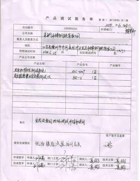 2014-10-30  山東萊鋼永鋒鋼鐵有限公司 進(jìn)行調(diào)試服務(wù),調(diào)試產(chǎn)品:CYBR-V變壓器容量及空負(fù)載測(cè)試儀   CYGC-600T發(fā)電機(jī)特性測(cè)試系統(tǒng)