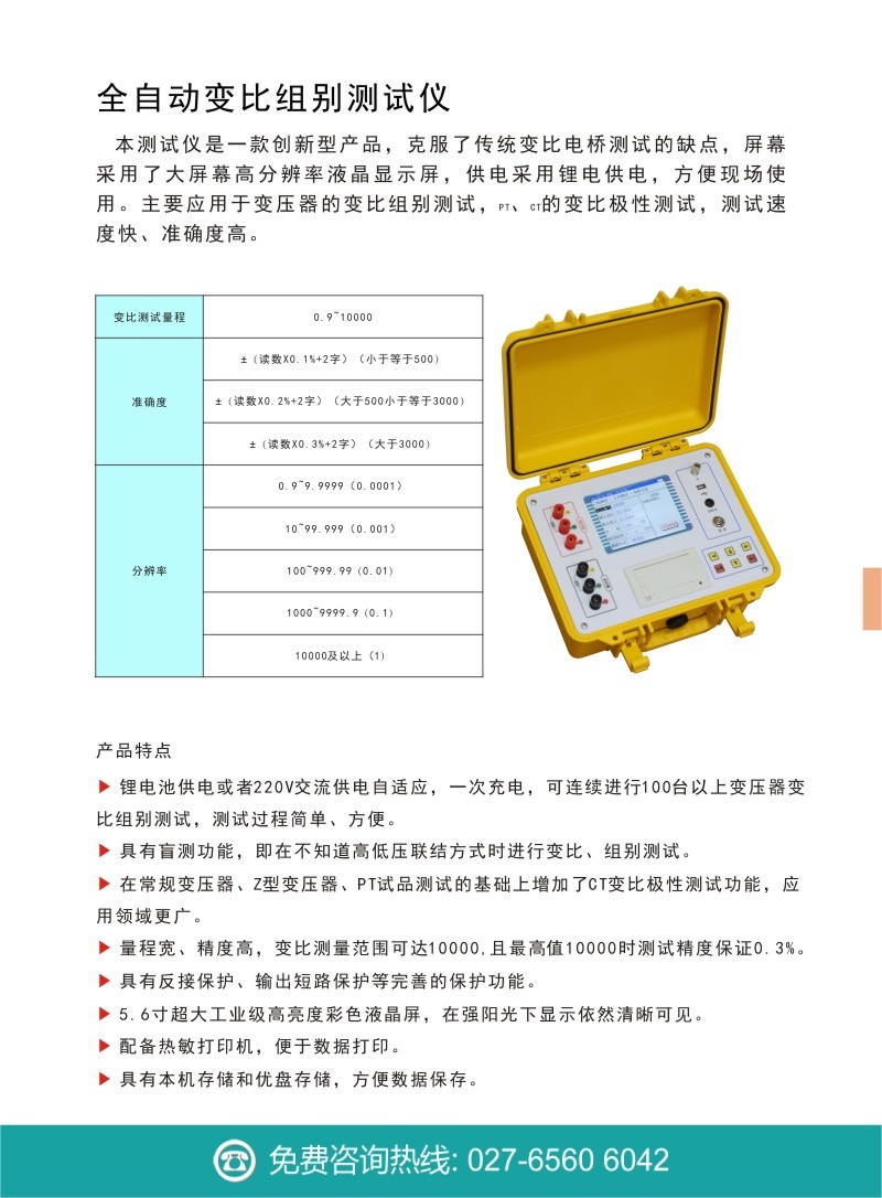 產(chǎn)品主要應(yīng)用于變壓器的變比組別測試,PT、CT的變比極性測試,測試速度快、準(zhǔn)確度高。