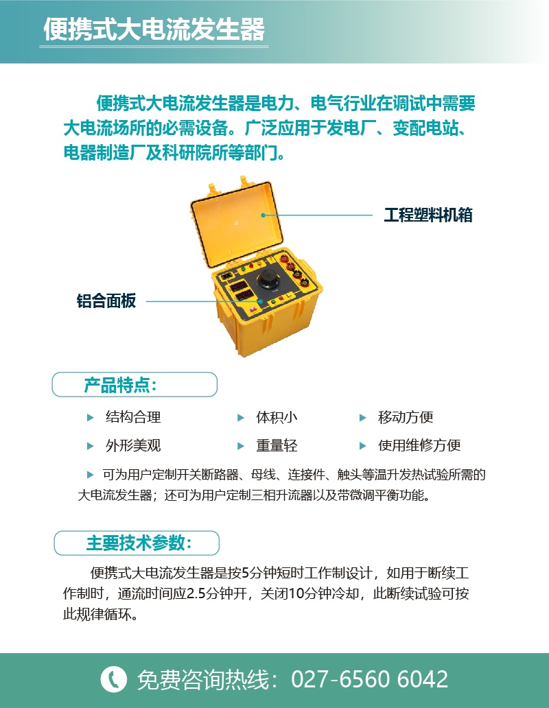CYSL-BX-100便攜式大電流發(fā)生器是按5分鐘短時工作制設(shè)計,如用于斷續(xù)工作制時,通流時間應(yīng)2.5分鐘開,關(guān)閉10分鐘冷卻,此斷續(xù)試驗可按此規(guī)律循環(huán);本產(chǎn)品由工程塑料機(jī)箱及鋁合面板組合而成,具有結(jié)構(gòu)合理、外形美觀、重量輕且移動方便等特點(diǎn)。